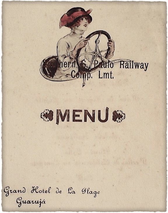 Na Coleção Washington Luis, o menu de 20 de setembro de 1921 – no Grand Hotel de La Plage, na cidade do Guarujá, SP –, chamou a atenção entre os demais exemplares, por várias questões: primeiro, há uma mulher ao volante de um automóvel – nessa época era comum mulheres ao volante? Segundo, a lista está redigida em francês, comum à época visto a forte influência francesa nos padrões comportamentais da nossa sociedade, com evidentes repercussões no convívio social, especialmente nas ocasiões festivas, mas foi servido “Leitão a Brasileira”, no lugar de “Peru” – prato recorrente em todos os cardápios analisados no doutorado. Interessante que a iguaria era nomeada de acordo com o momento político vivido pelo Brasil, como se pode ver: “Dindin imperiale”, “Dinde a la Republique”, a “Dinde à brésillienne” e “Peru à brasileira”.