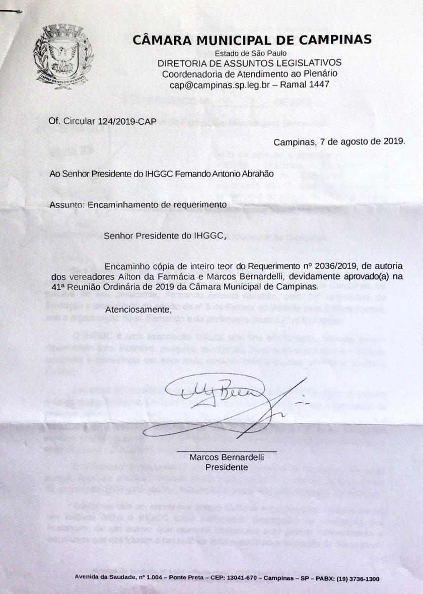 Em um mundo imediatista e regado à inovação e tecnologia, fundamental se faz o reconhecimento desta Câmara de Vereadores ao IHGGC tanto para Campinas quanto para a região em sua missão precípua de preservação histórica.