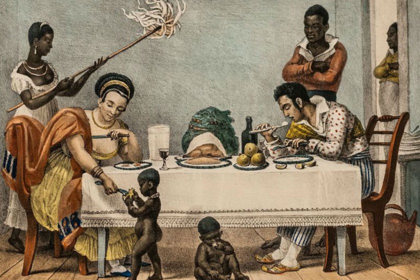 Em Um Jantar brasileiro (1827), uma das pinturas mais reproduzidas em nossos livros de História, do pintor francês J. B. Debret, da coleção – Viagem pitoresca e histórica do Brasil – o autor define as personagens da sala de jantar de uma casa senhorial do Rio de Janeiro: o casal de brancos, abastado, bem acomodados nas pontas de uma mesa bem servida. À margem os escravos domésticos, uma mulher negra que abana os seus senhores, dois homens negros que parecem aguardar as ordens do casal, e duas crianças negras nuas sendo alimentadas pela dona da casa, como se fossem cachorrinhos.